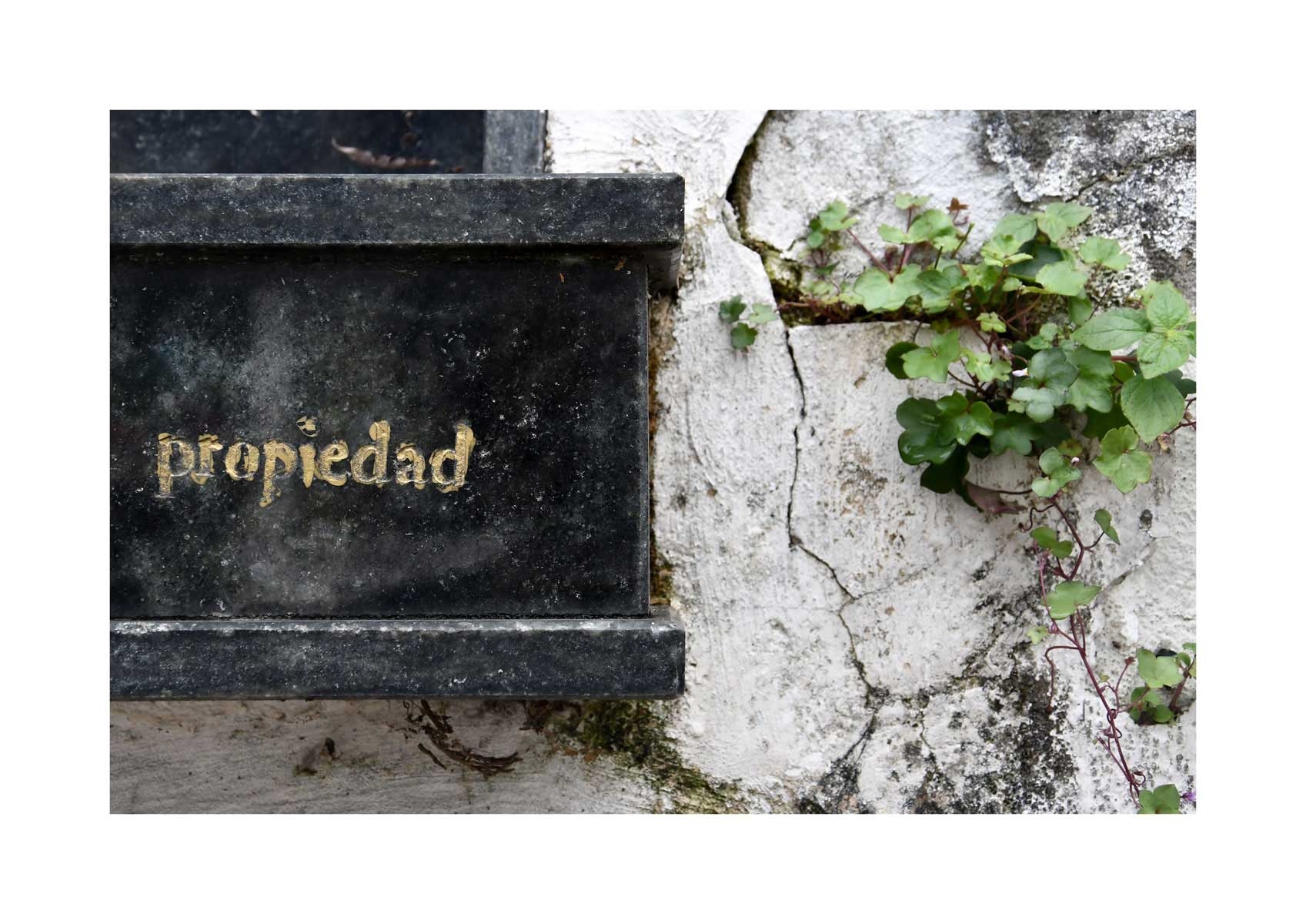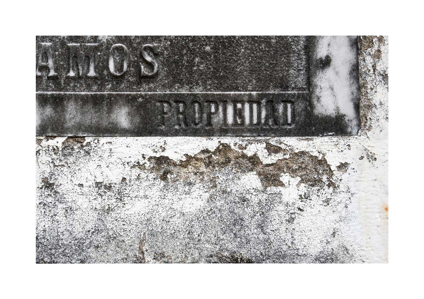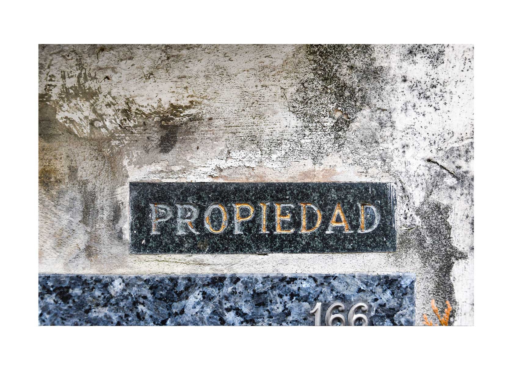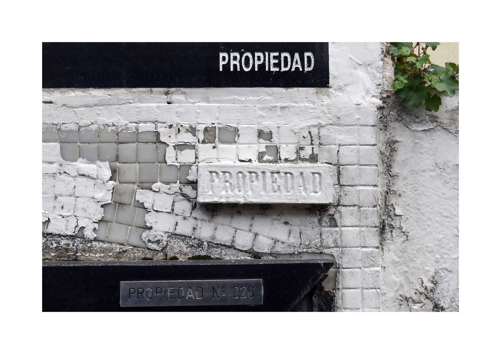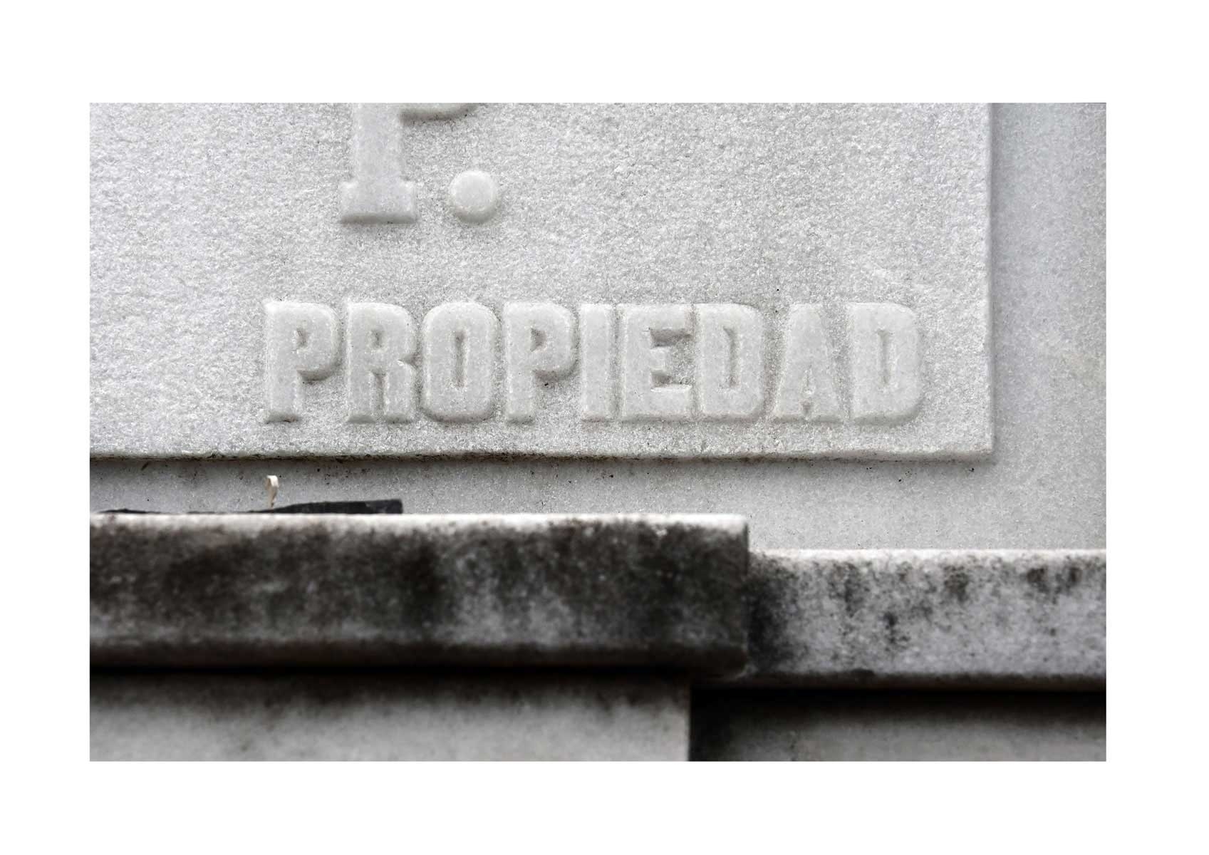 En Propiedad, el artista convierte la palabra grabada en los nichos de un cementerio en un eco de la crisis contemporánea. A través de la repetición del término “propiedad”, la serie revela la ironía de una sociedad que garantiza a los muertos lo que niega a los vivos: un lugar propio.