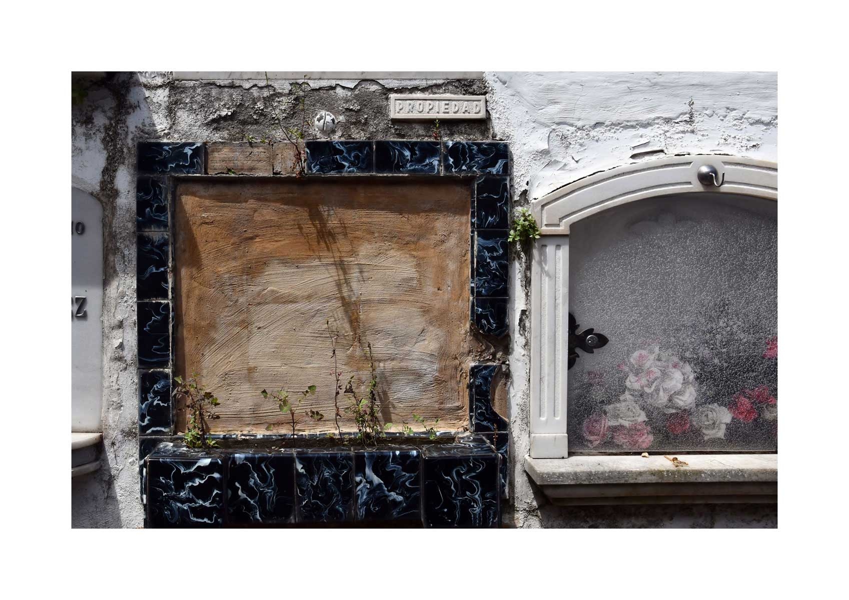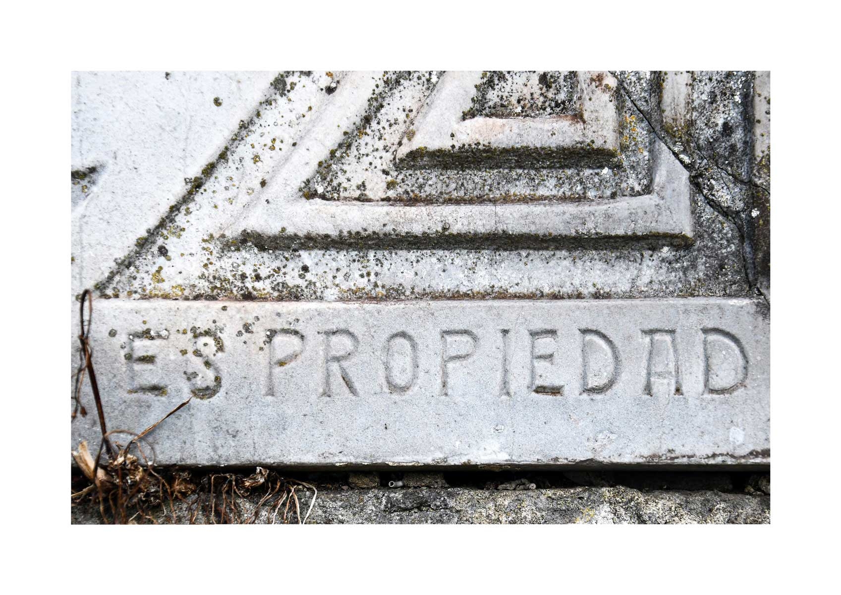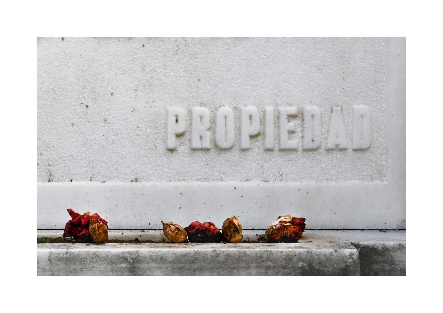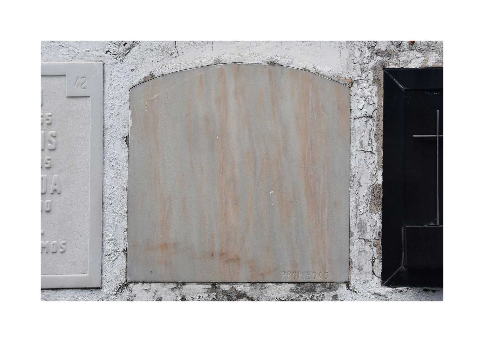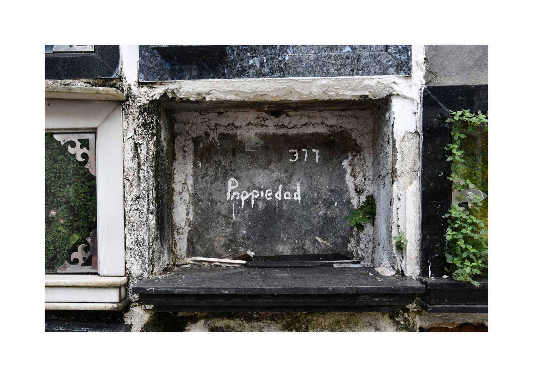 En Propiedad, el artista convierte la palabra grabada en los nichos de un cementerio en un eco de la crisis contemporánea. A través de la repetición del término “propiedad”, la serie revela la ironía de una sociedad que garantiza a los muertos lo que niega a los vivos: un lugar propio.