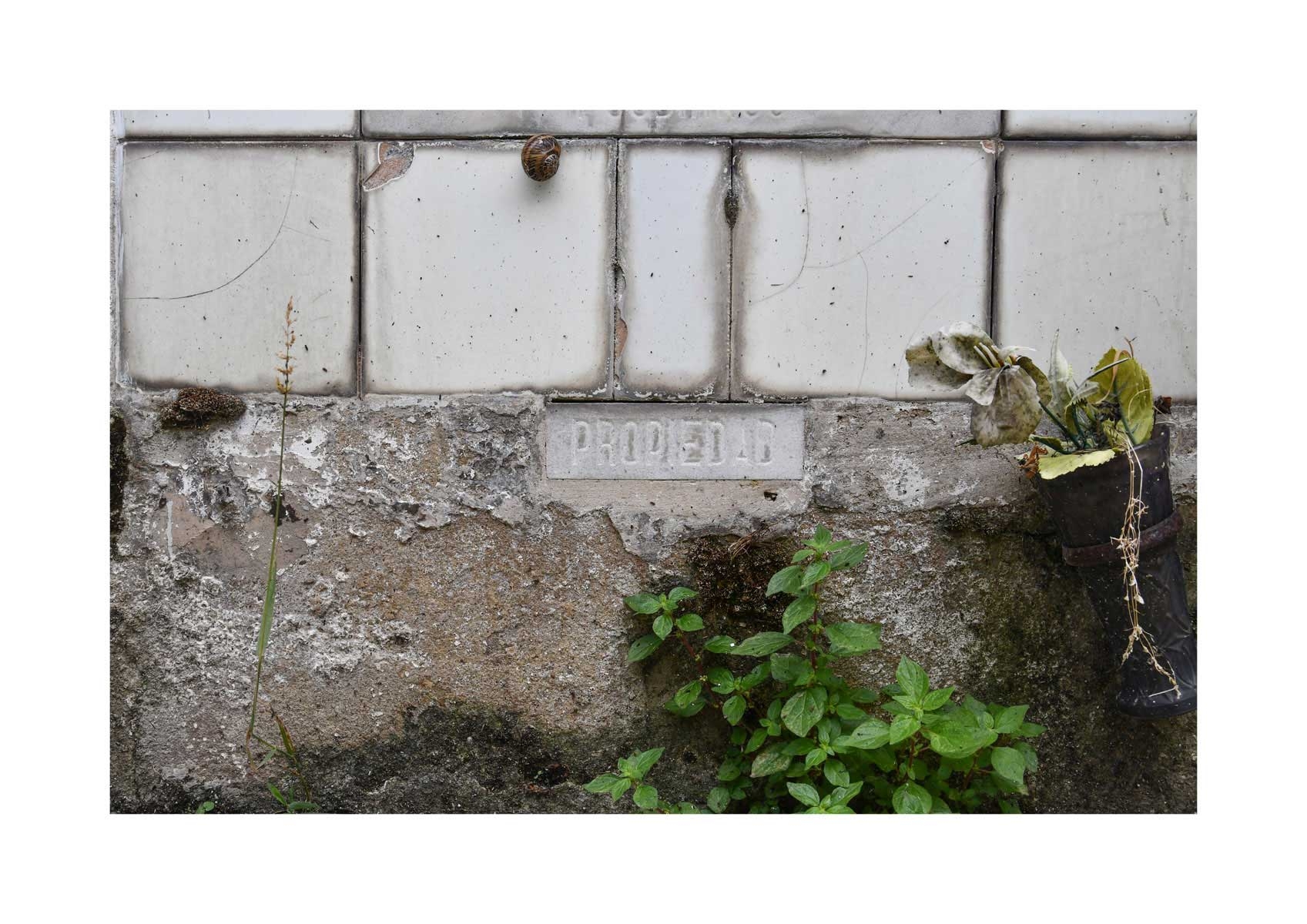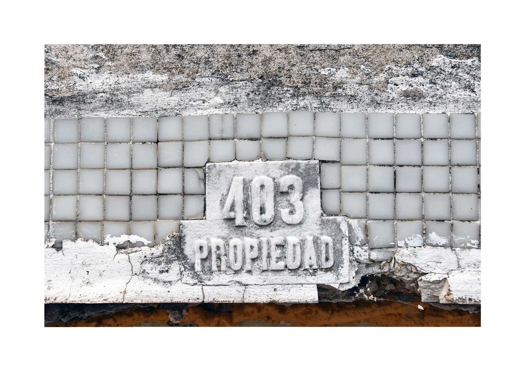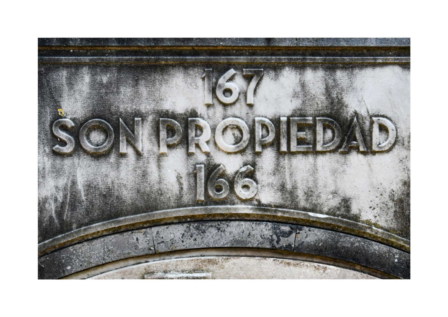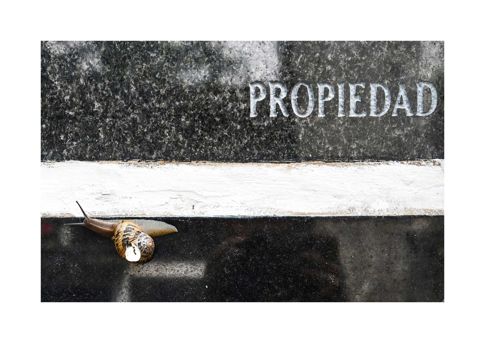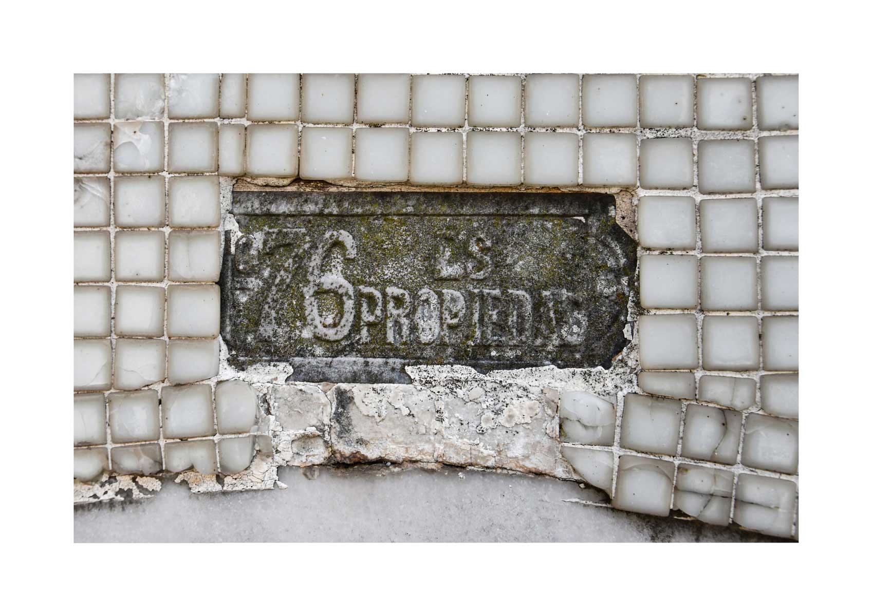 En Propiedad, el artista convierte la palabra grabada en los nichos de un cementerio en un eco de la crisis contemporánea. A través de la repetición del término “propiedad”, la serie revela la ironía de una sociedad que garantiza a los muertos lo que niega a los vivos: un lugar propio.