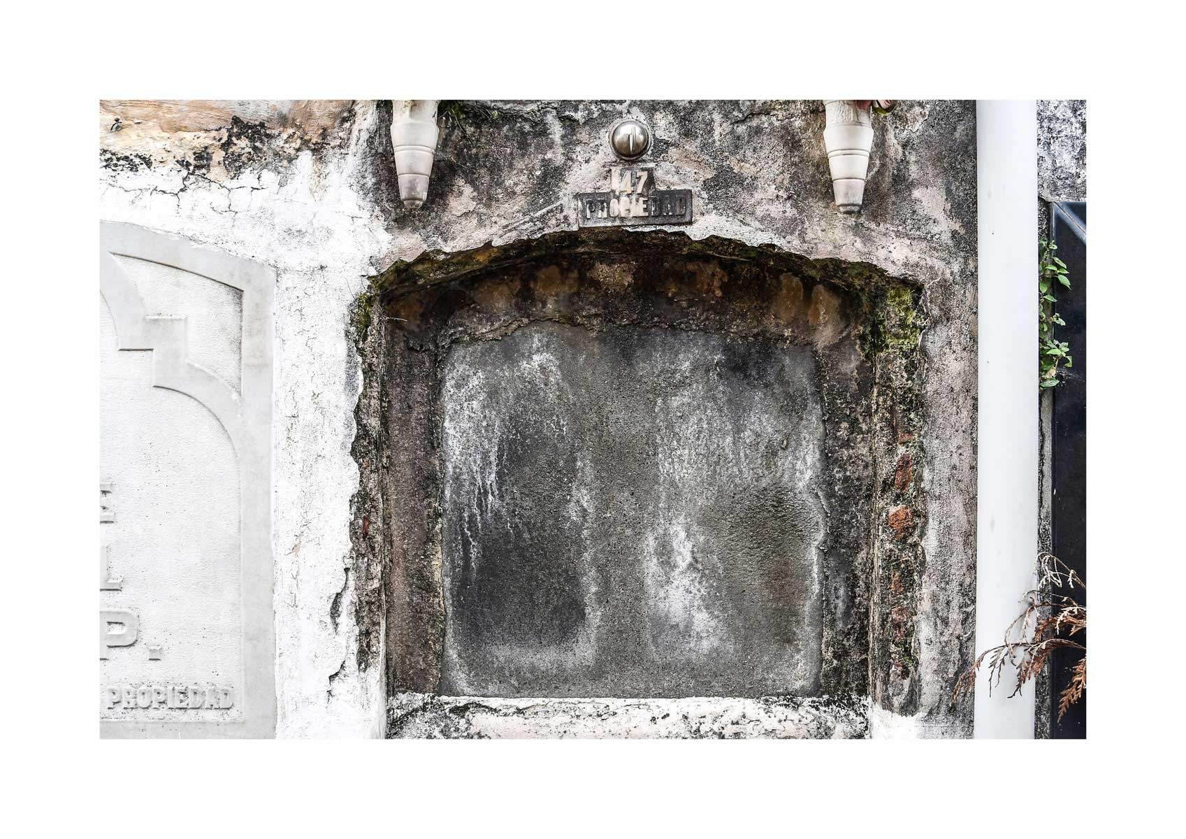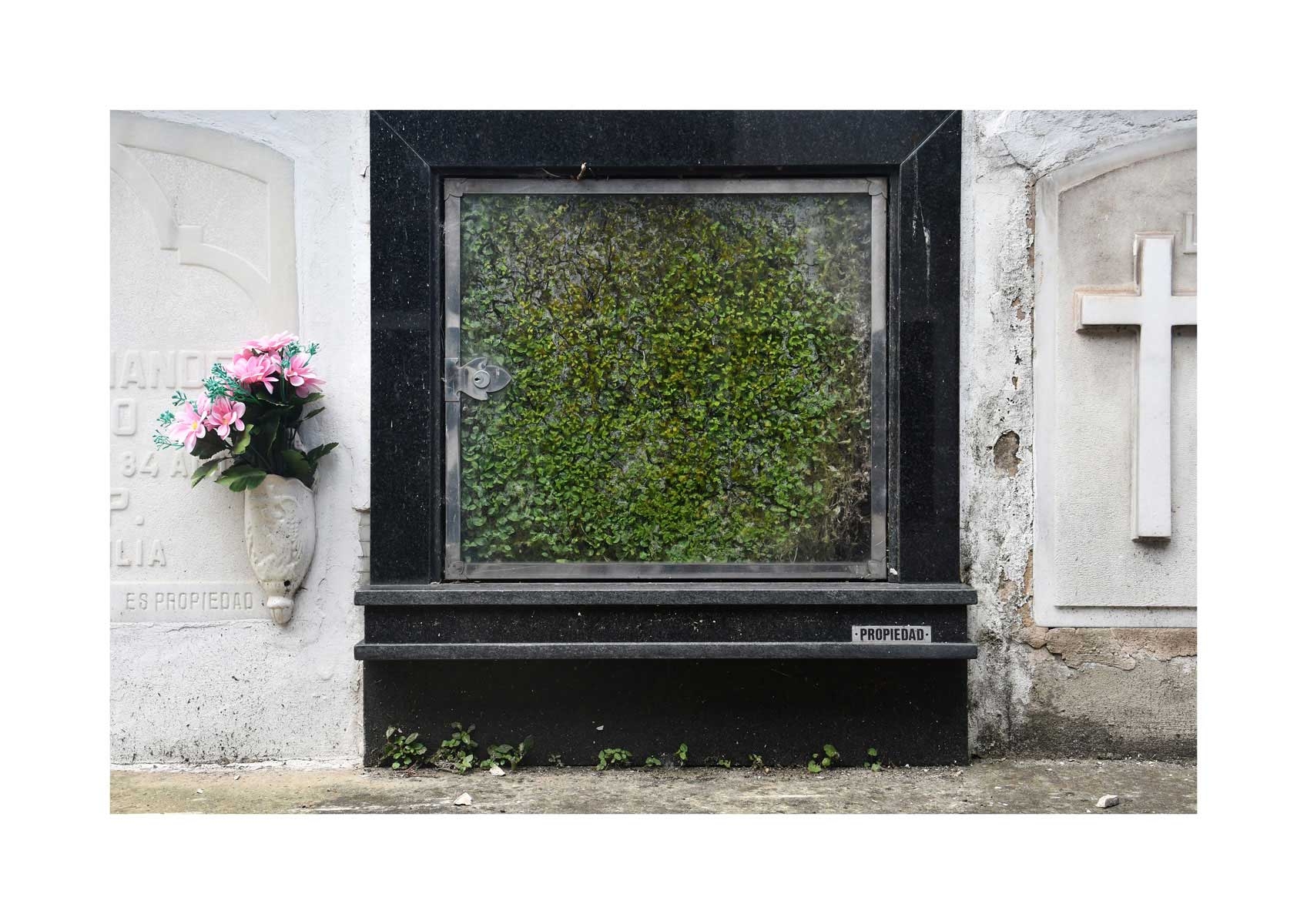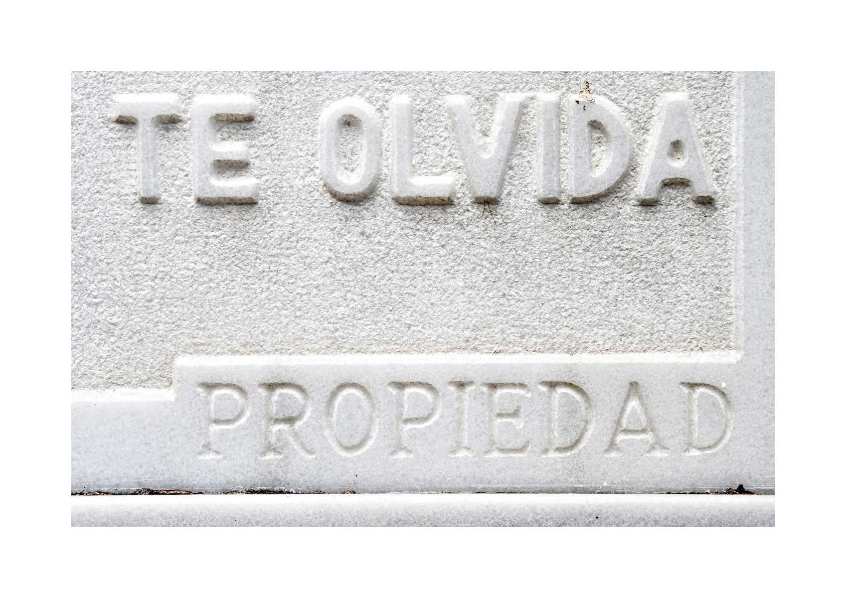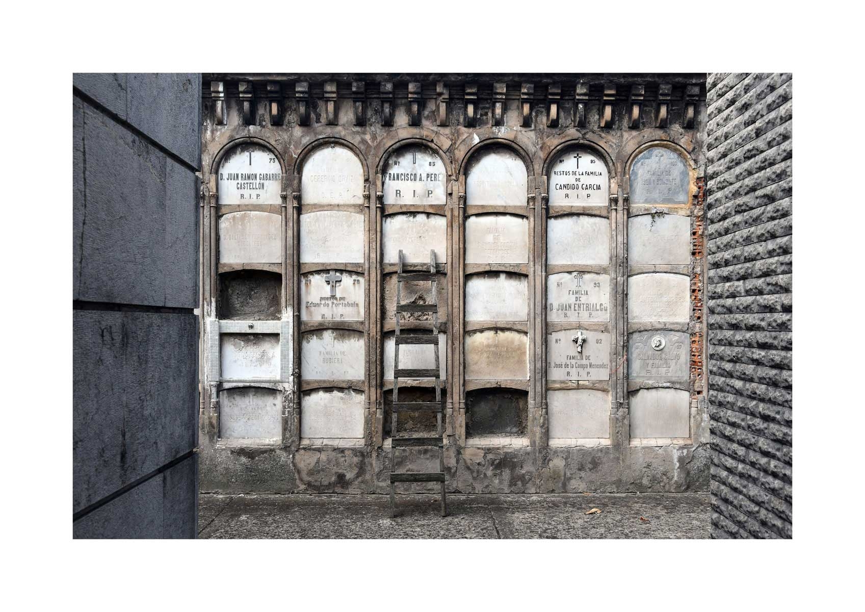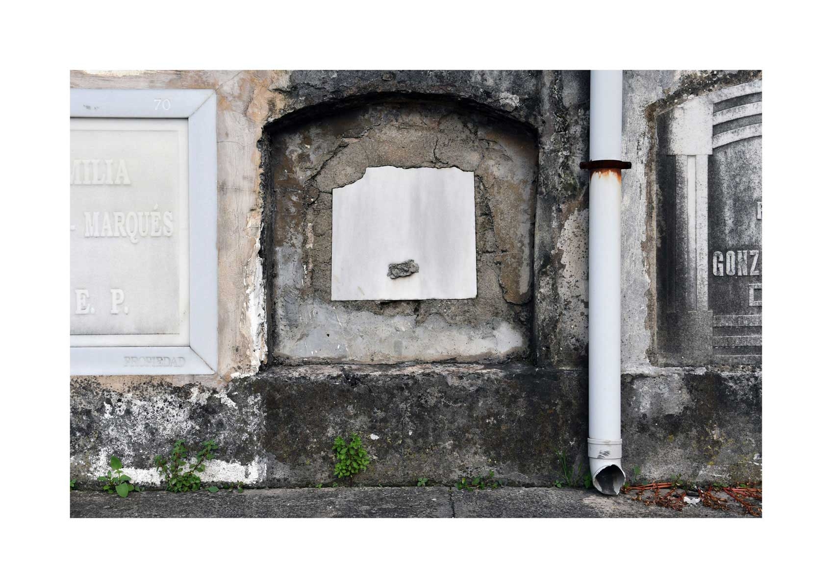 En Propiedad, el artista convierte la palabra grabada en los nichos de un cementerio en un eco de la crisis contemporánea. A través de la repetición del término “propiedad”, la serie revela la ironía de una sociedad que garantiza a los muertos lo que niega a los vivos: un lugar propio.