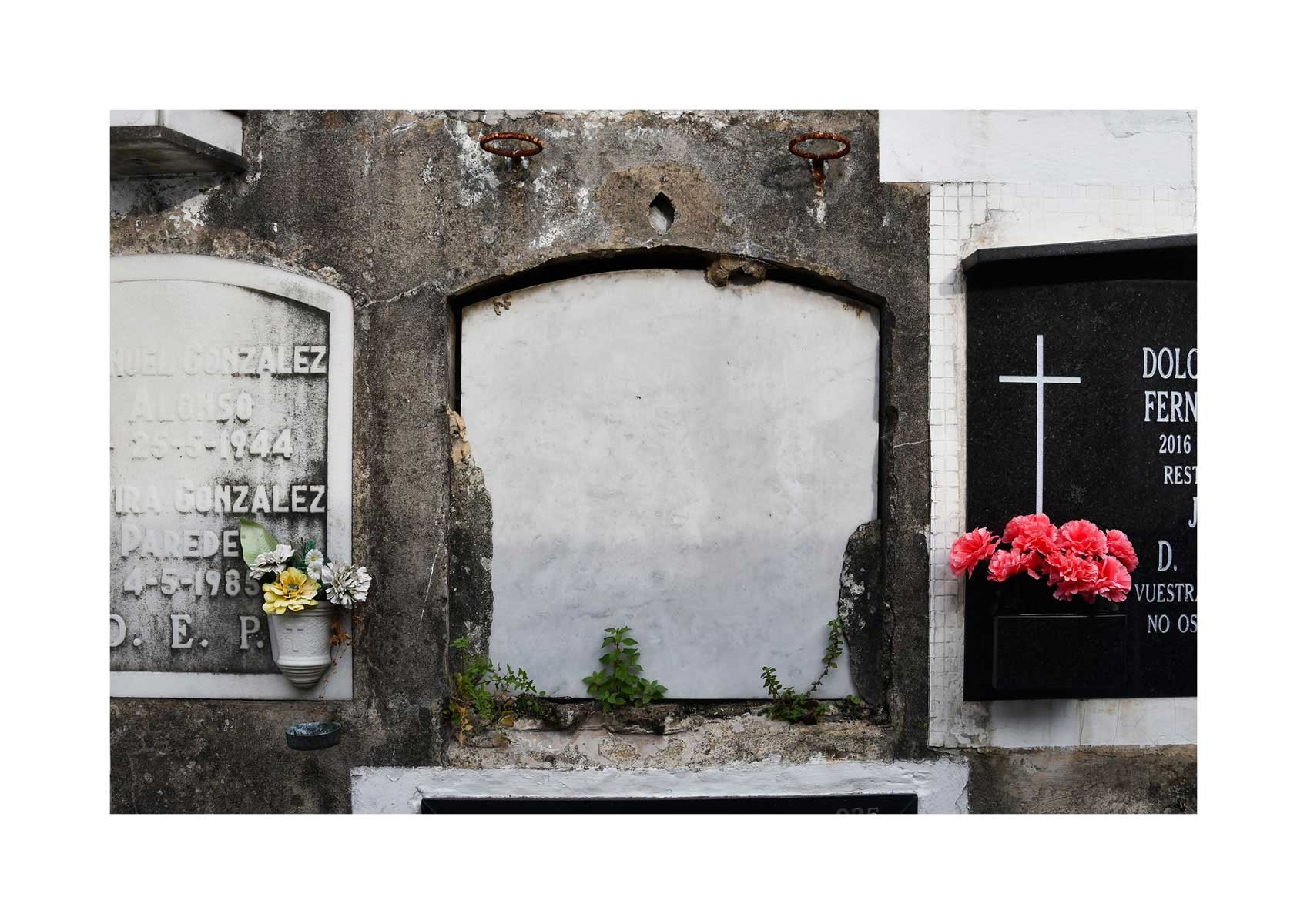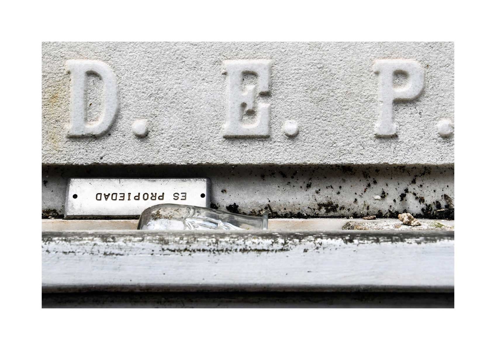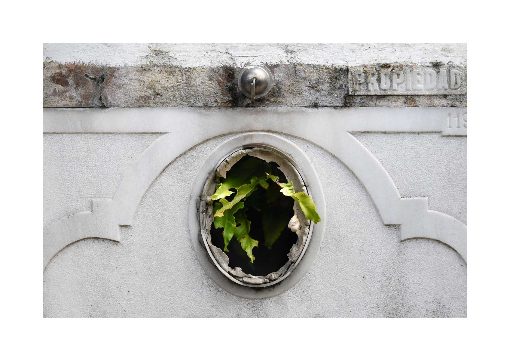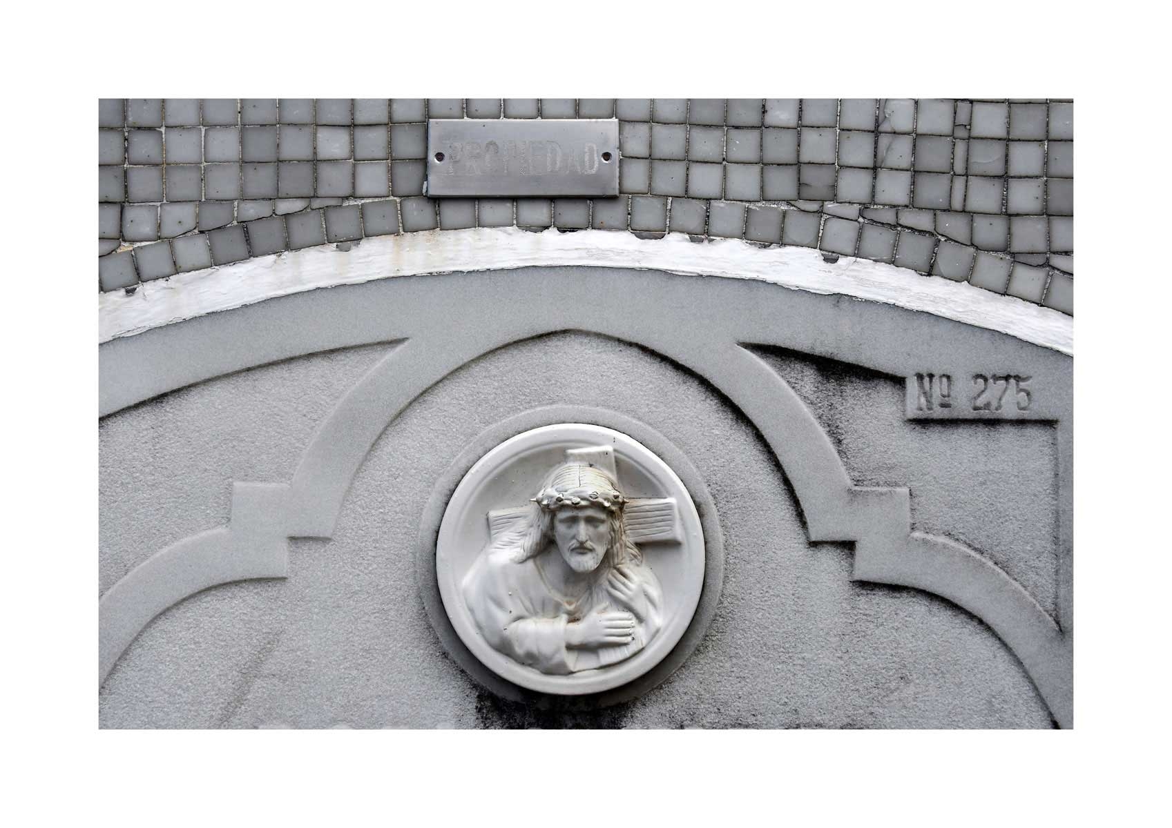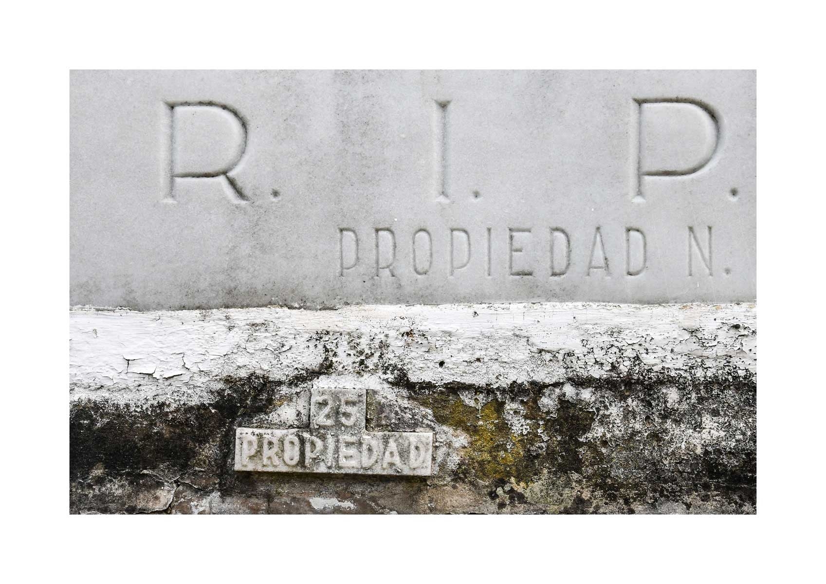 En Propiedad, el artista convierte la palabra grabada en los nichos de un cementerio en un eco de la crisis contemporánea. A través de la repetición del término “propiedad”, la serie revela la ironía de una sociedad que garantiza a los muertos lo que niega a los vivos: un lugar propio.