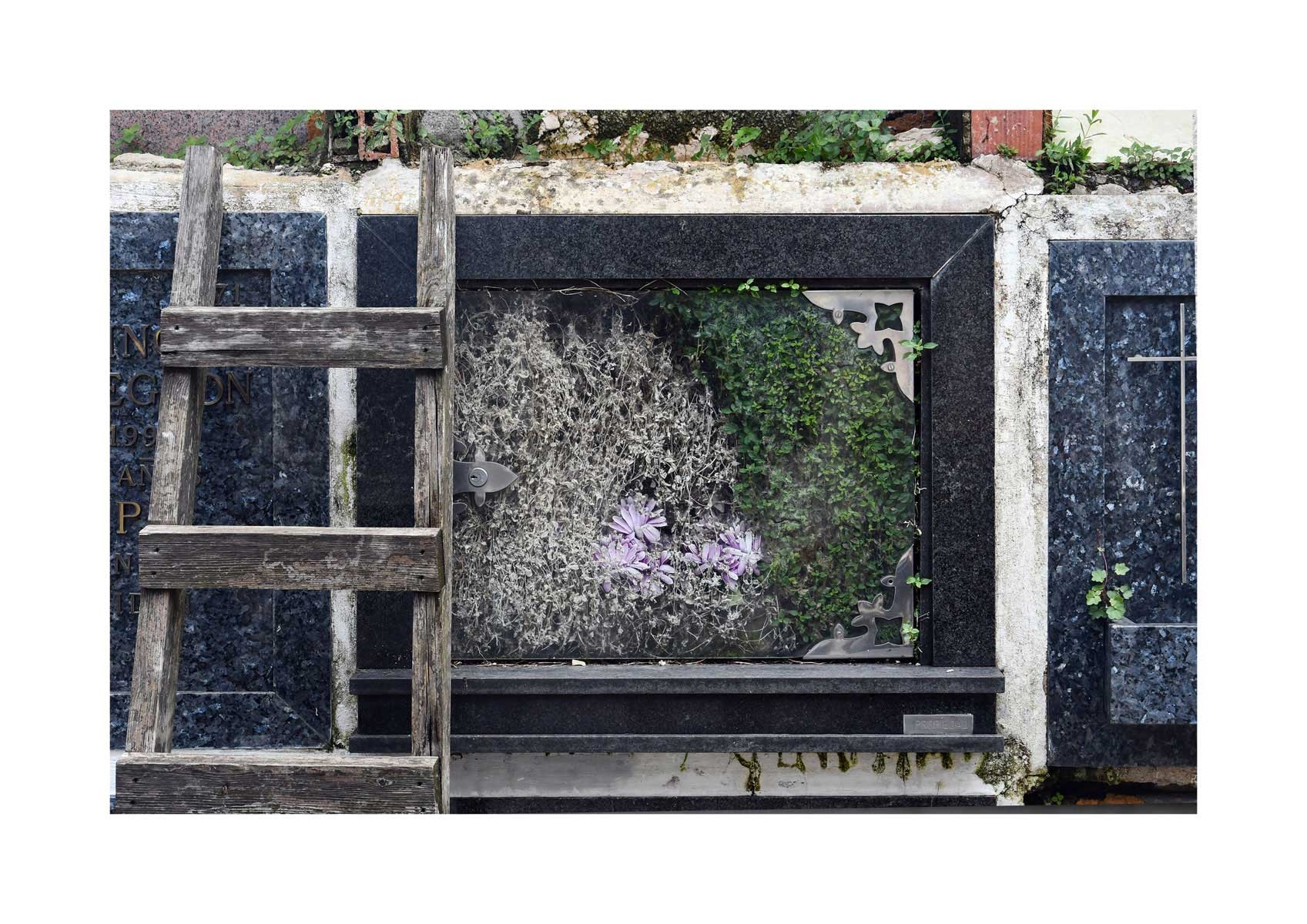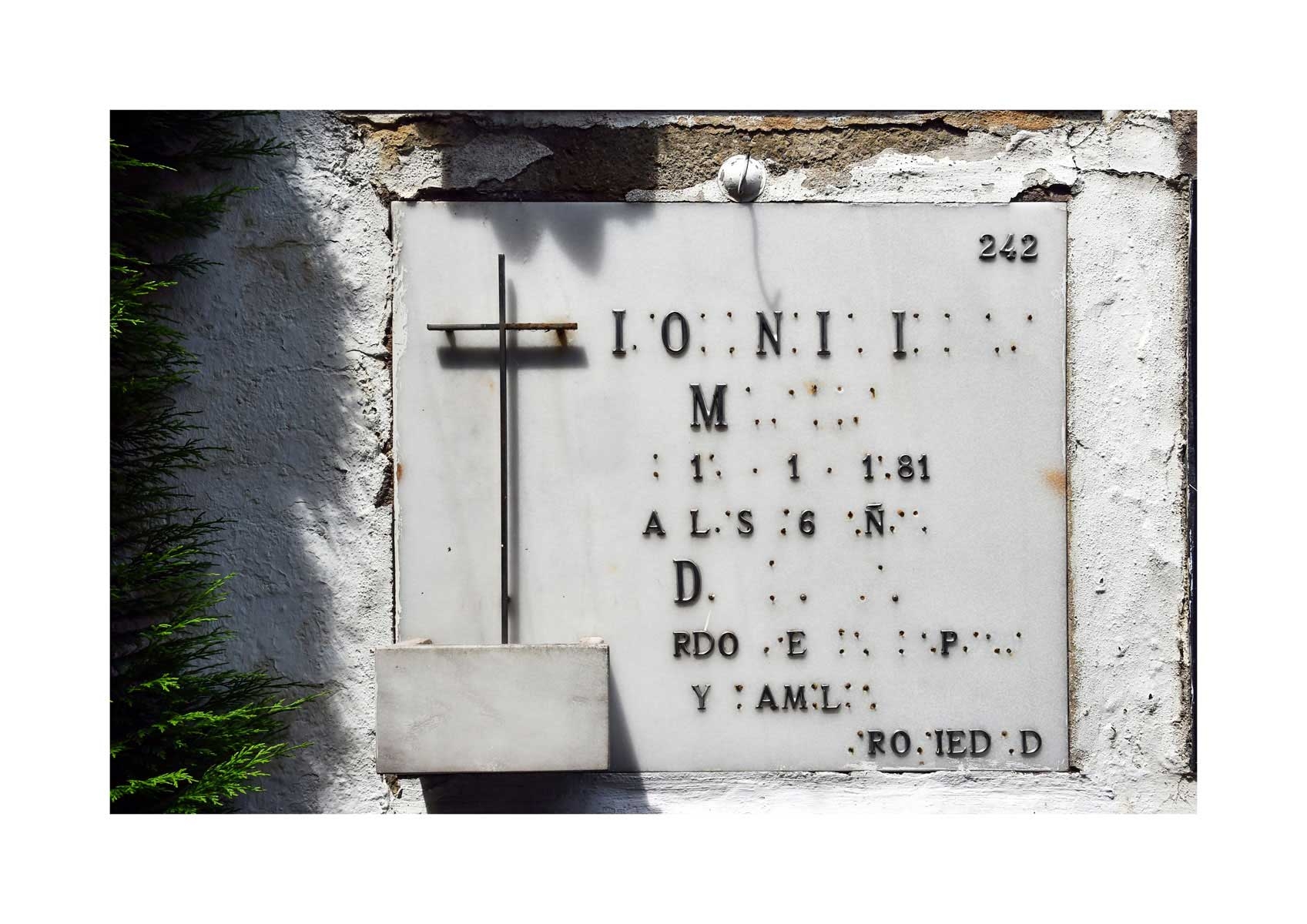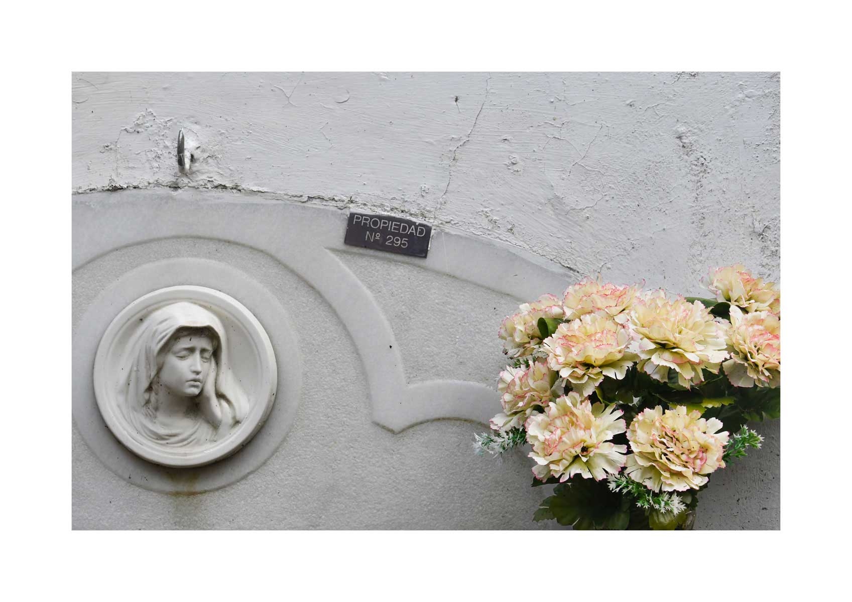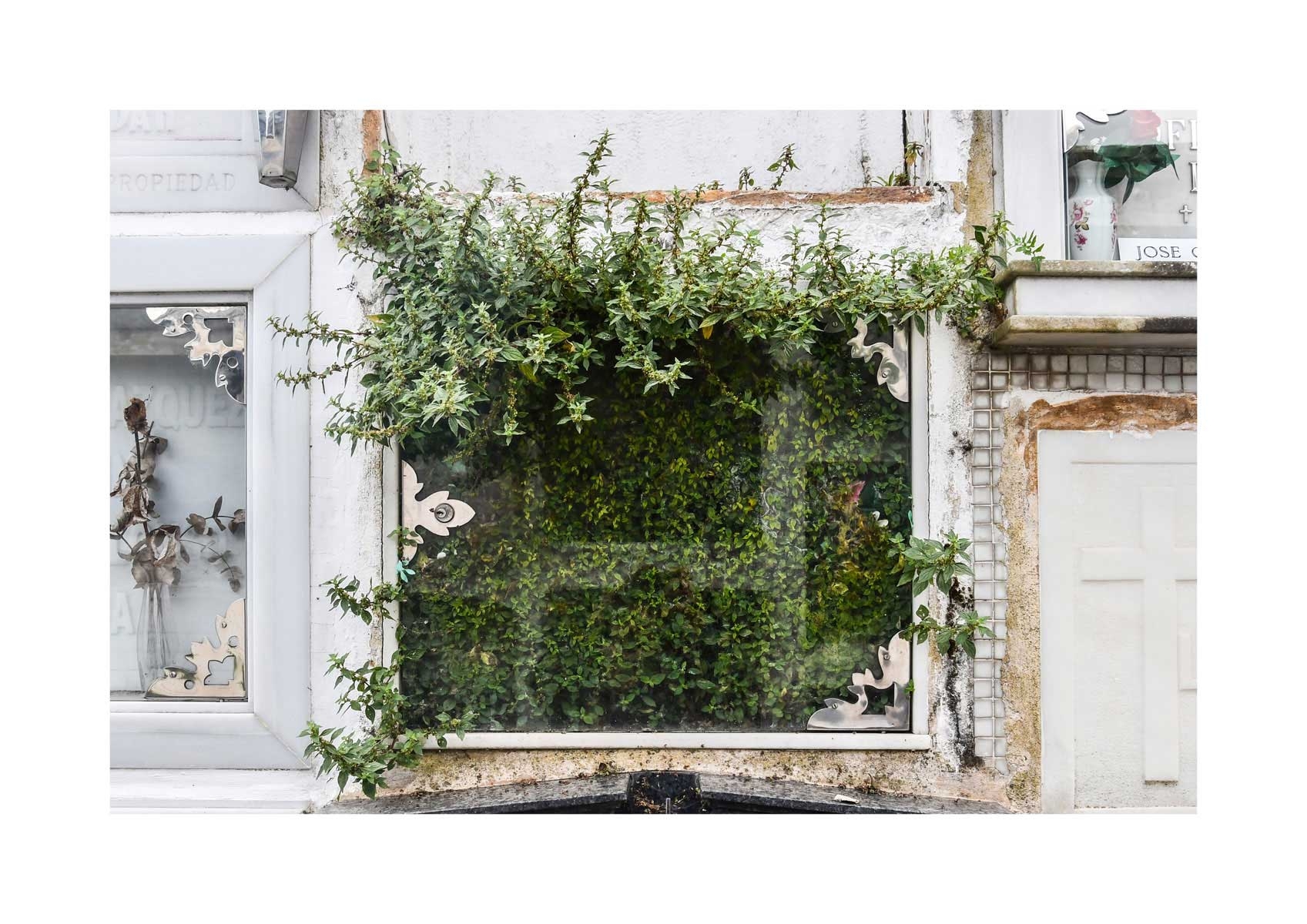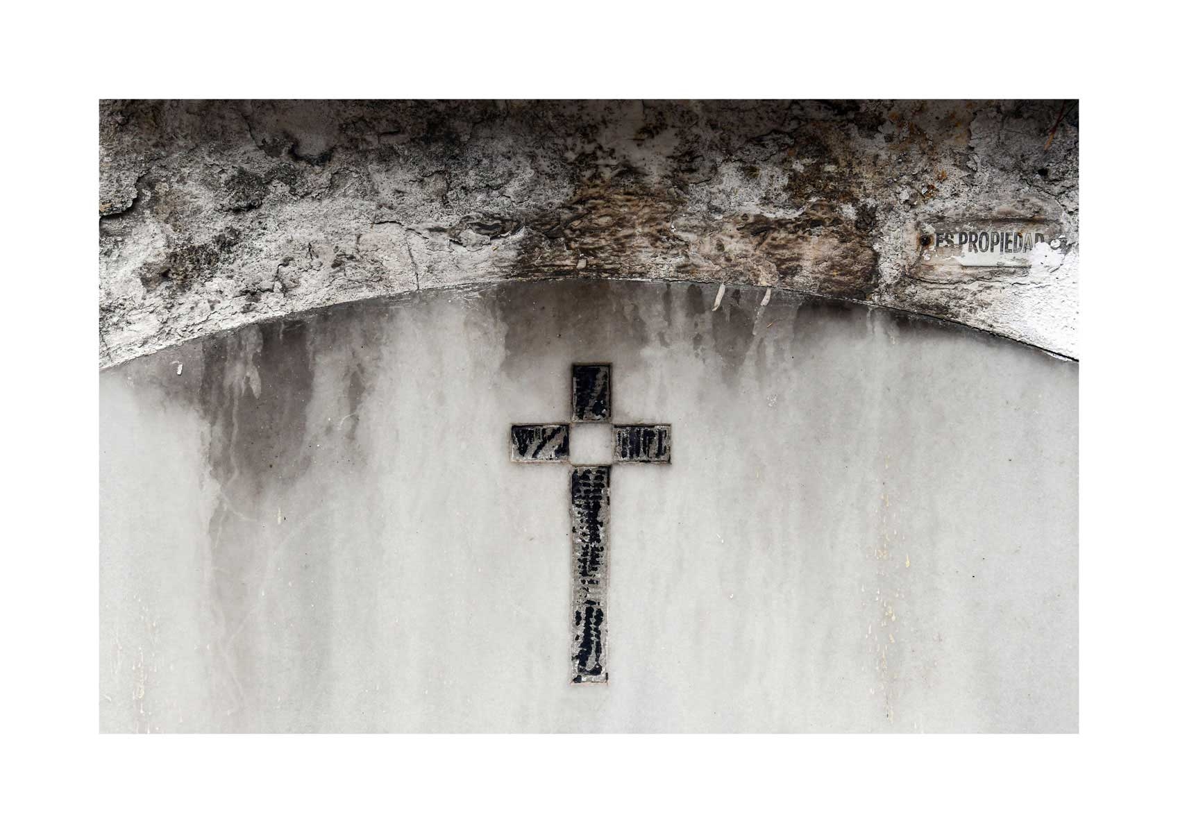 En Propiedad, el artista convierte la palabra grabada en los nichos de un cementerio en un eco de la crisis contemporánea. A través de la repetición del término “propiedad”, la serie revela la ironía de una sociedad que garantiza a los muertos lo que niega a los vivos: un lugar propio.