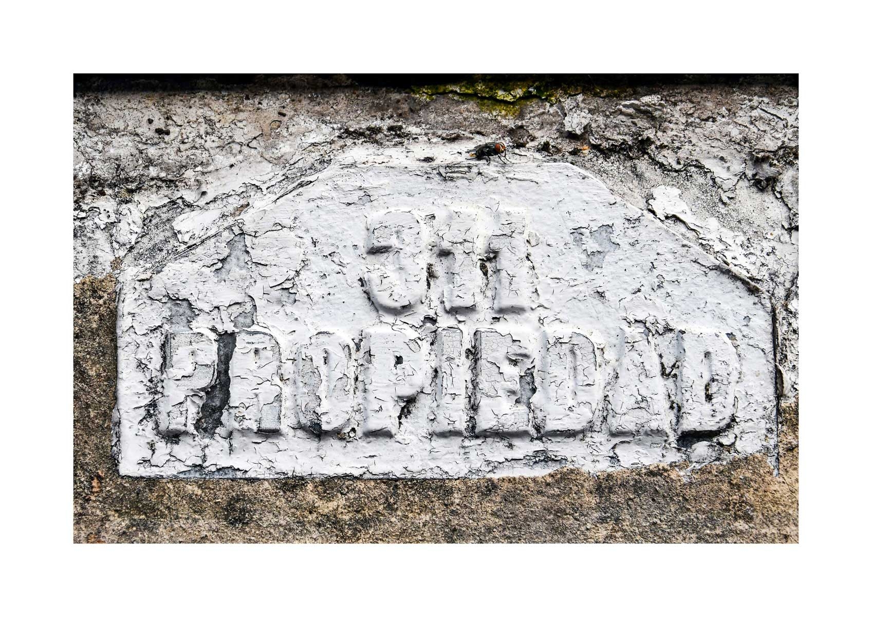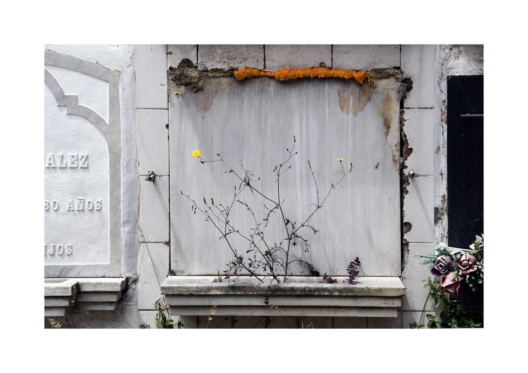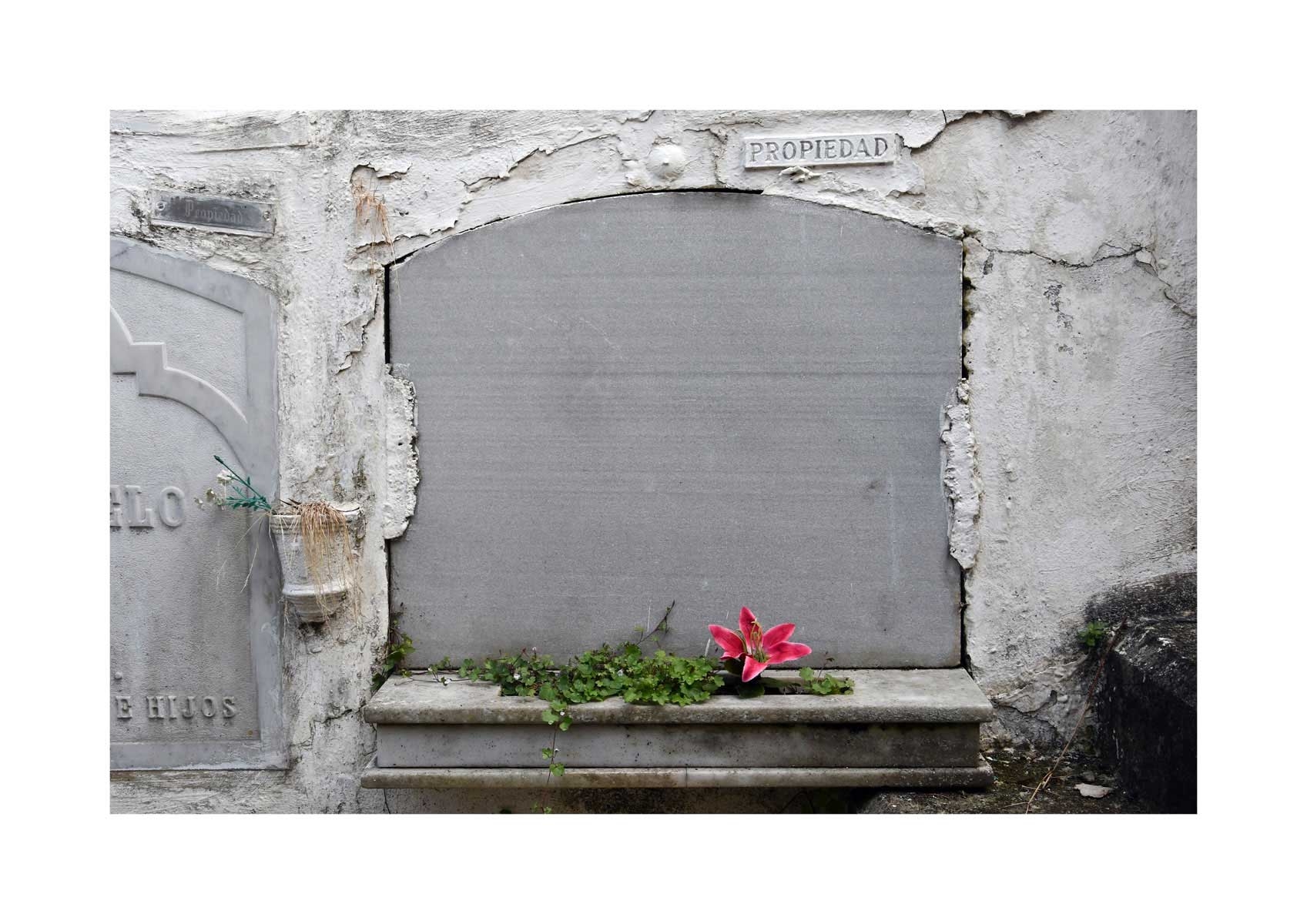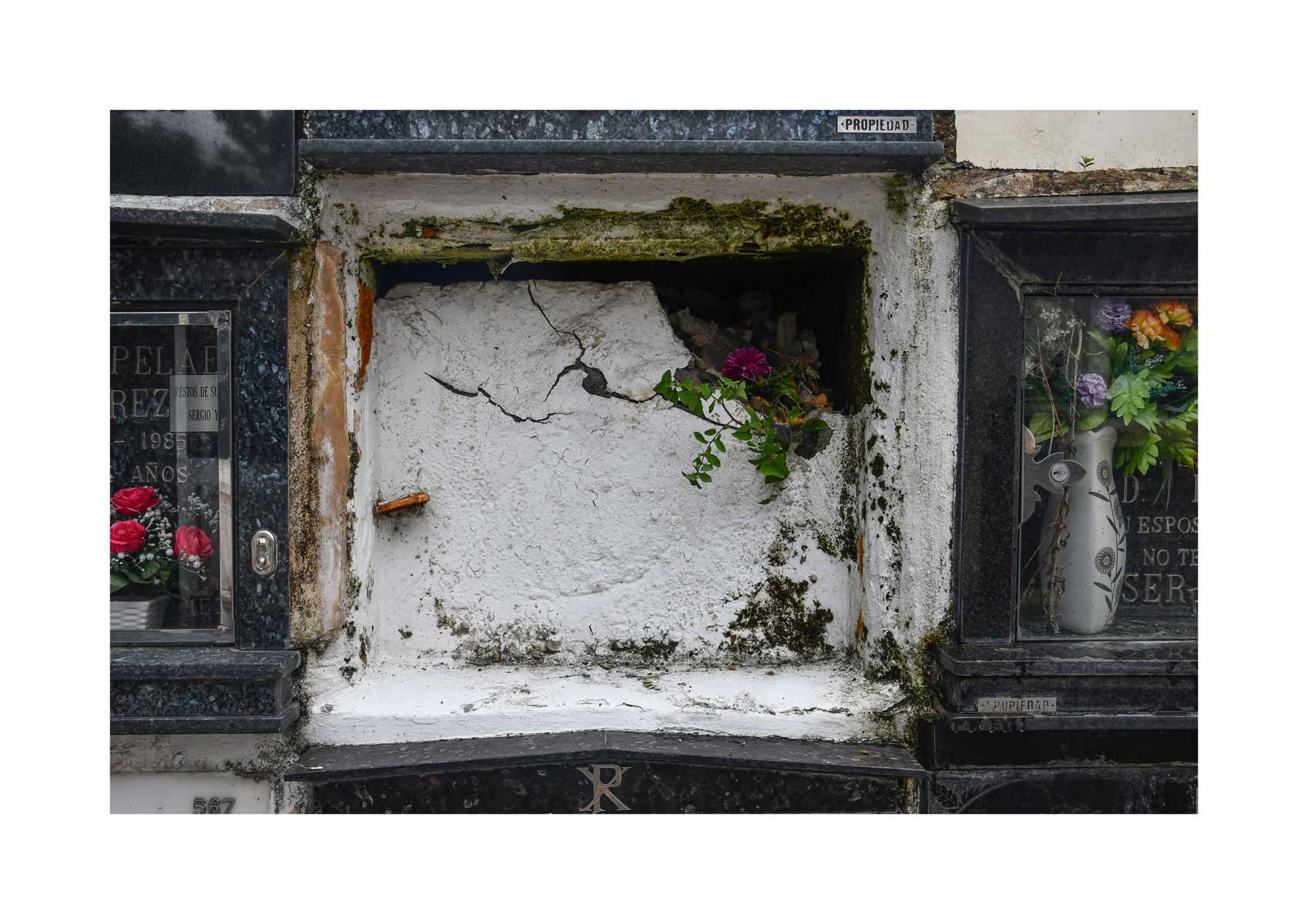 En Propiedad, el artista convierte la palabra grabada en los nichos de un cementerio en un eco de la crisis contemporánea. A través de la repetición del término “propiedad”, la serie revela la ironía de una sociedad que garantiza a los muertos lo que niega a los vivos: un lugar propio.